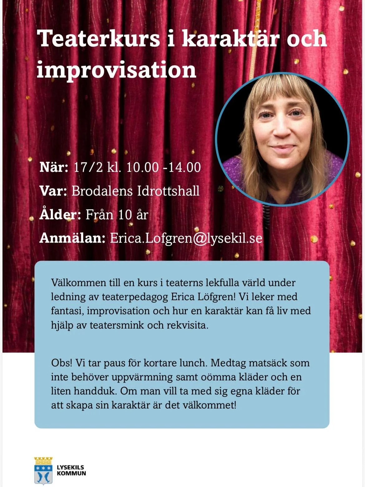 Anmälan sker till: erica.lofgren@lysekil.se (senast måndag 16/2, kl.18).